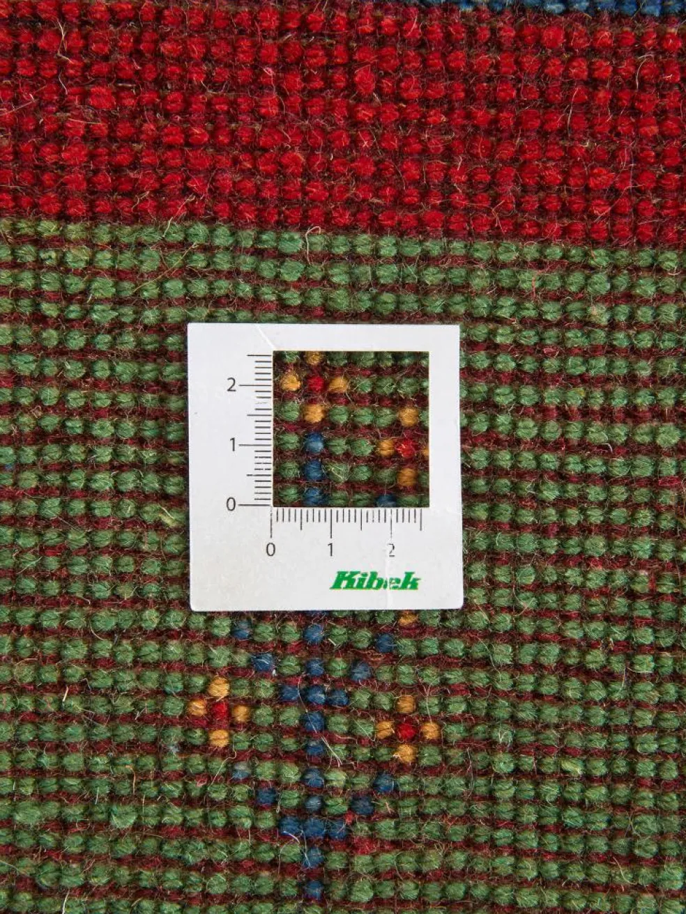 . Die Schur ist relativ hoch, der Griff fest. Die Muster sind meist schlicht oder eine Kombination mit traditionellen Mustern. Mustervorlagen gibt es nicht. Geknüpft werden alle Muster aus dem Kopf.| Gesamthöhe: | ca. 18 mm |