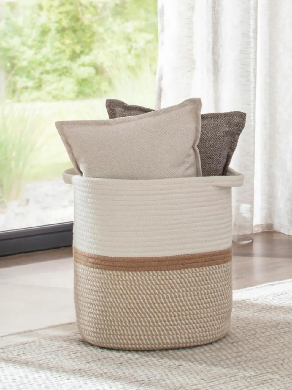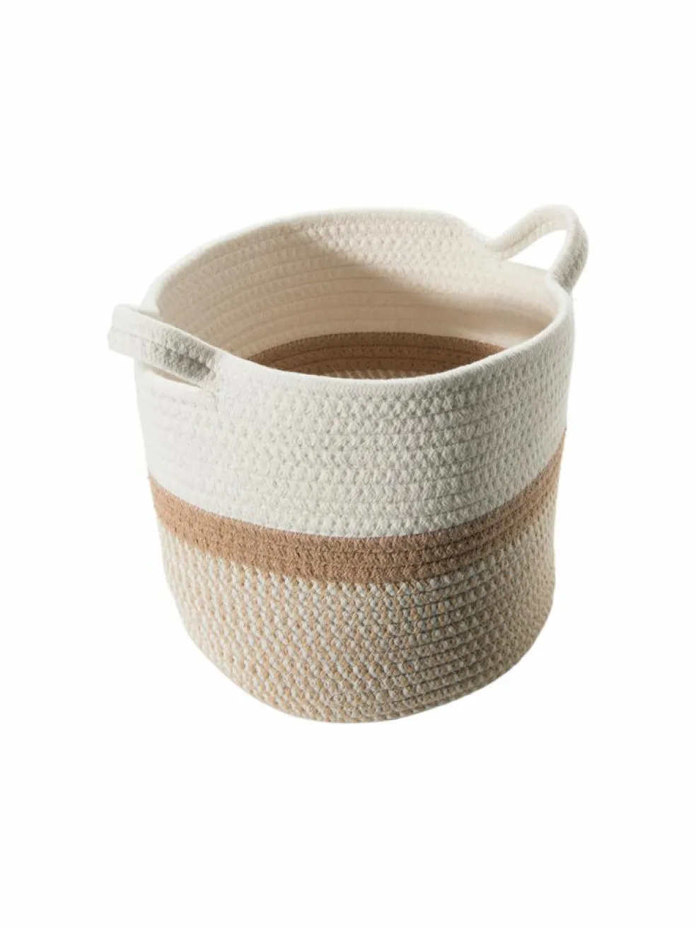 Zylindrischer Korb aus Baumwollkordel gefertigt. Mit praktischen Henkeln.