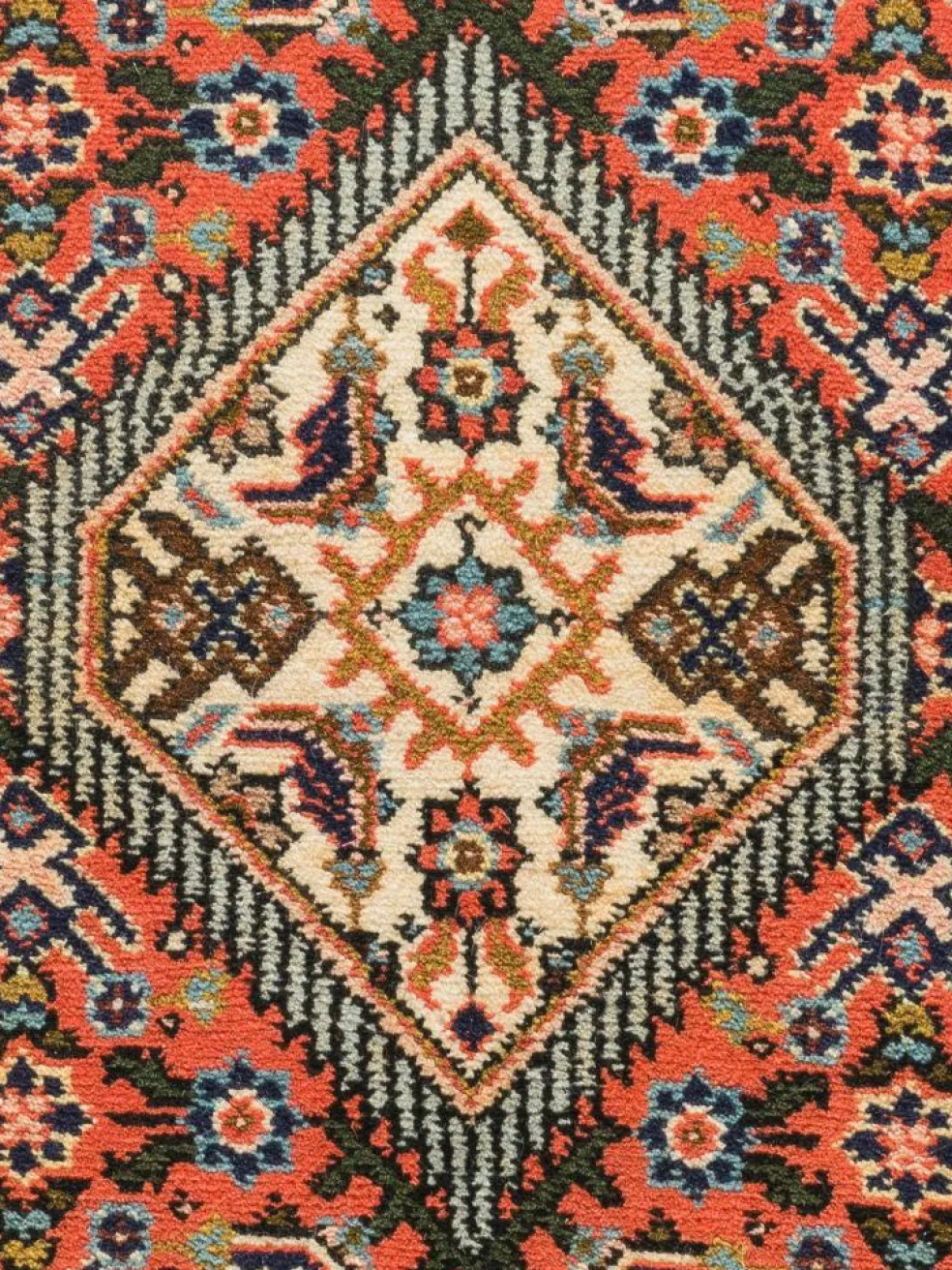 . Die Farben des Teppichs sind warm. Die Muster sind charakteristisch: Das Innenfeld ist mit einemMahi