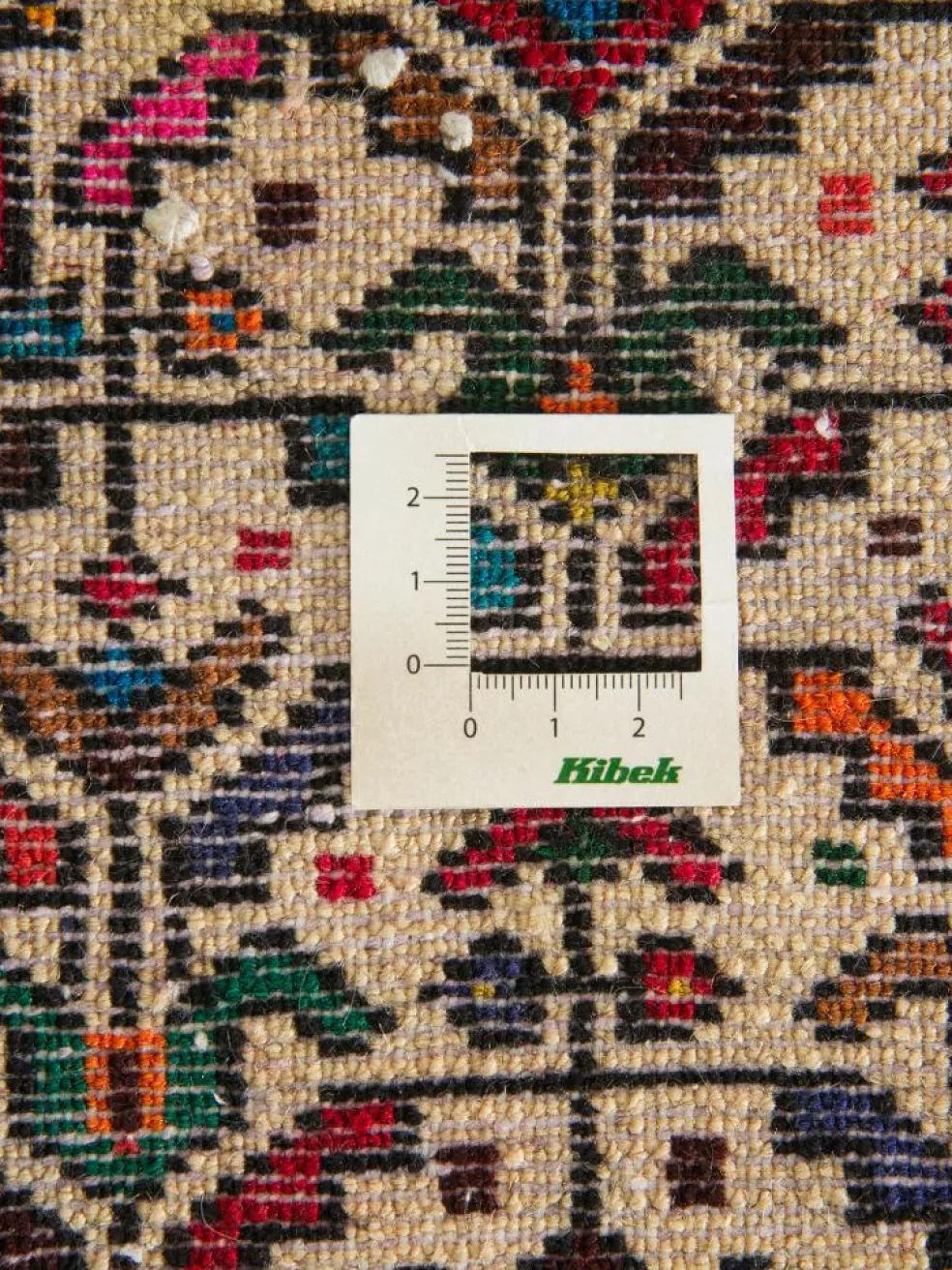 . Die Farben des Teppichs sind warm. Die Muster sind charakteristisch: Das Innenfeld ist mit einemMahi