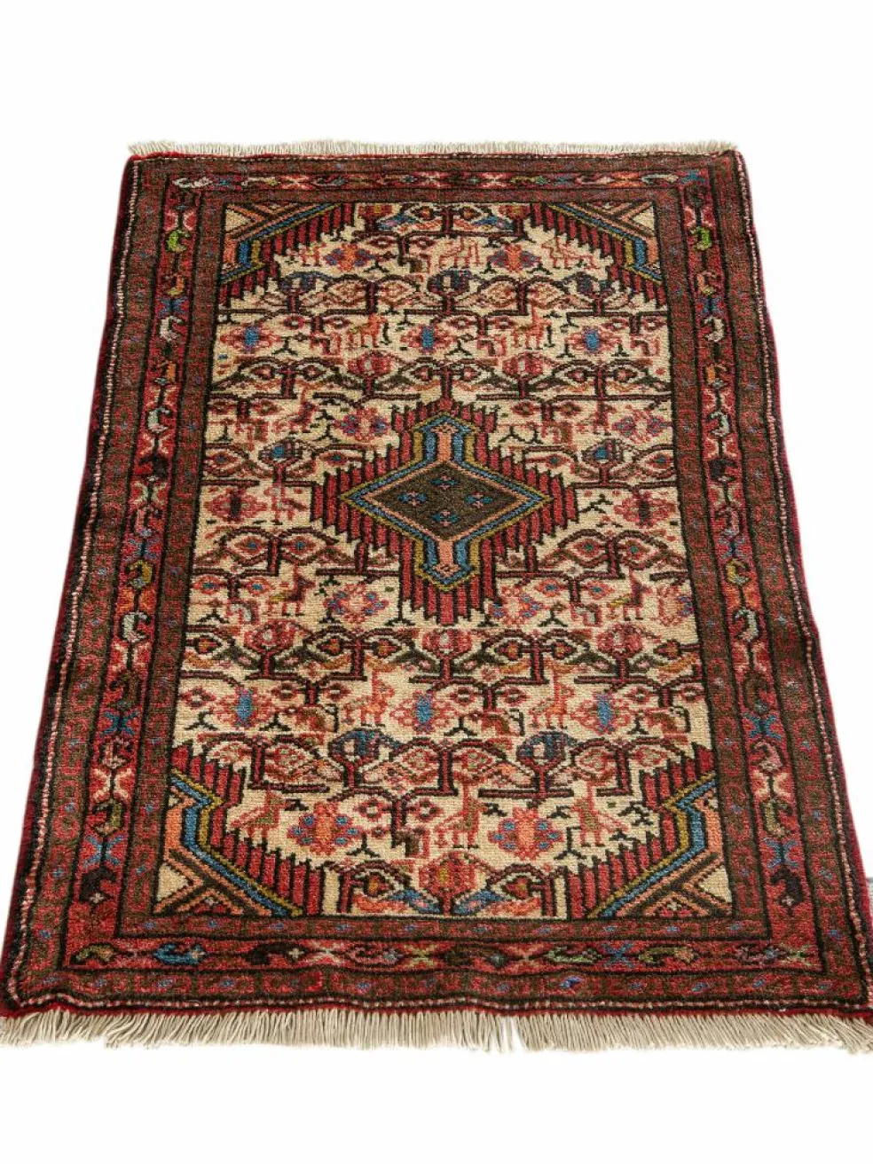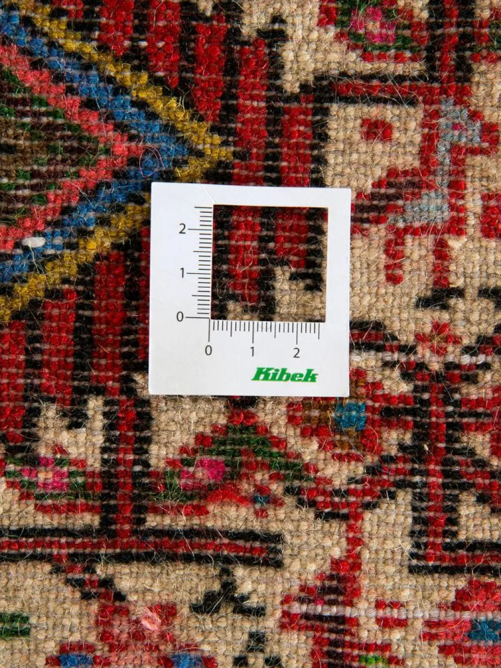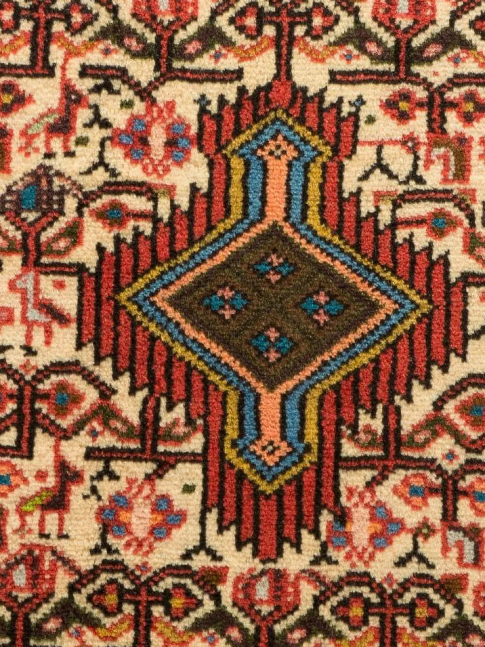 . Die Farben des Teppichs sind warm. Die Muster sind charakteristisch: Das Innenfeld ist mit einemMahi
