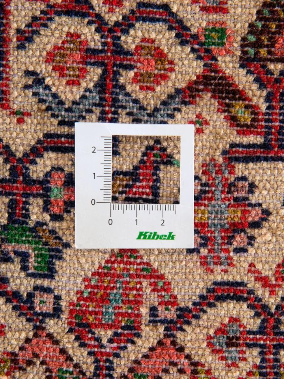. Die Farben des Teppichs sind warm. Die Muster sind charakteristisch: Das Innenfeld ist mit einemMahi