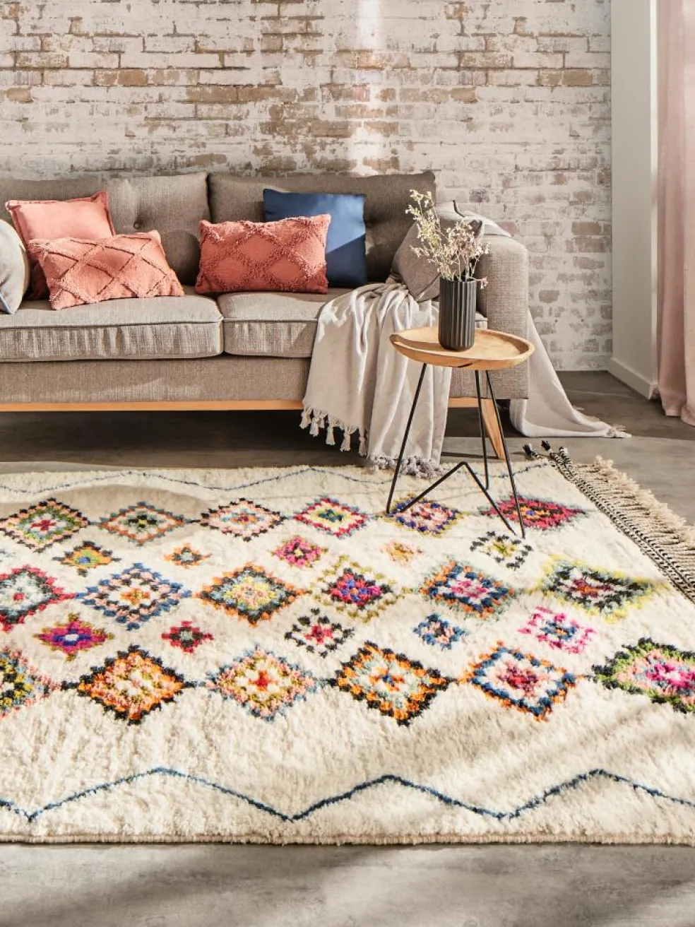 aus von Hand gearbeiteter Schafwolle. Eine aufwändig gestaltete Webkante mit hochwertigen Wollfransen rundet diesen Teppich ab.Azilal