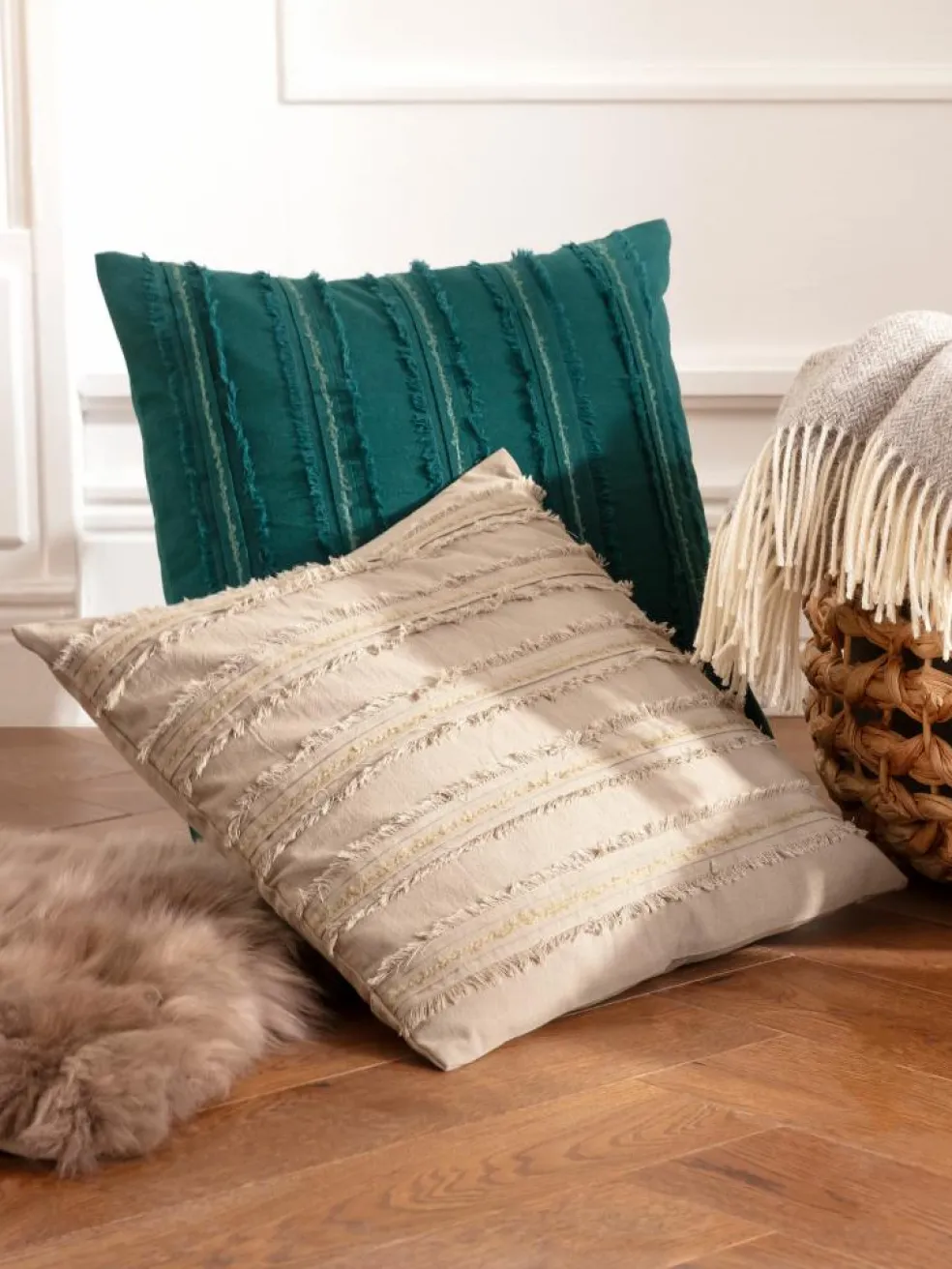 Ton in Ton: Unser Taree Kissen überzeugt mit seinen tollen Details. Grundmaterial und Verzierung sind im selben Farbton gehalten. Durch eine verspielte Verzierung mit offener Kantenverarbeitung entsteht ein moderner Streifen-Look, der sich dezent zurückhält und doch ins Auge fällt. Die zarten