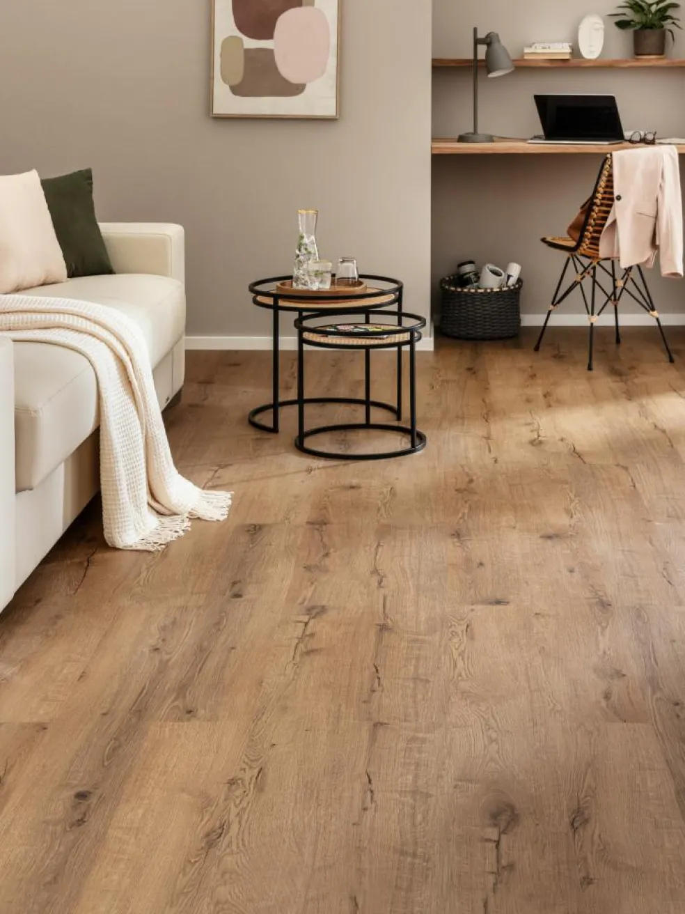 Authentisch geprägte Oberfläche. Gesamtstärke ca. 4 mm. Nutzschicht ca. 0,30 mm. 4-fach Micro-V-Fuge. Hoch belastbar. Klicksystem. Planken leimlos verlegbar. 20 Jahre Garantie. Nutzungsklasse 23/31.