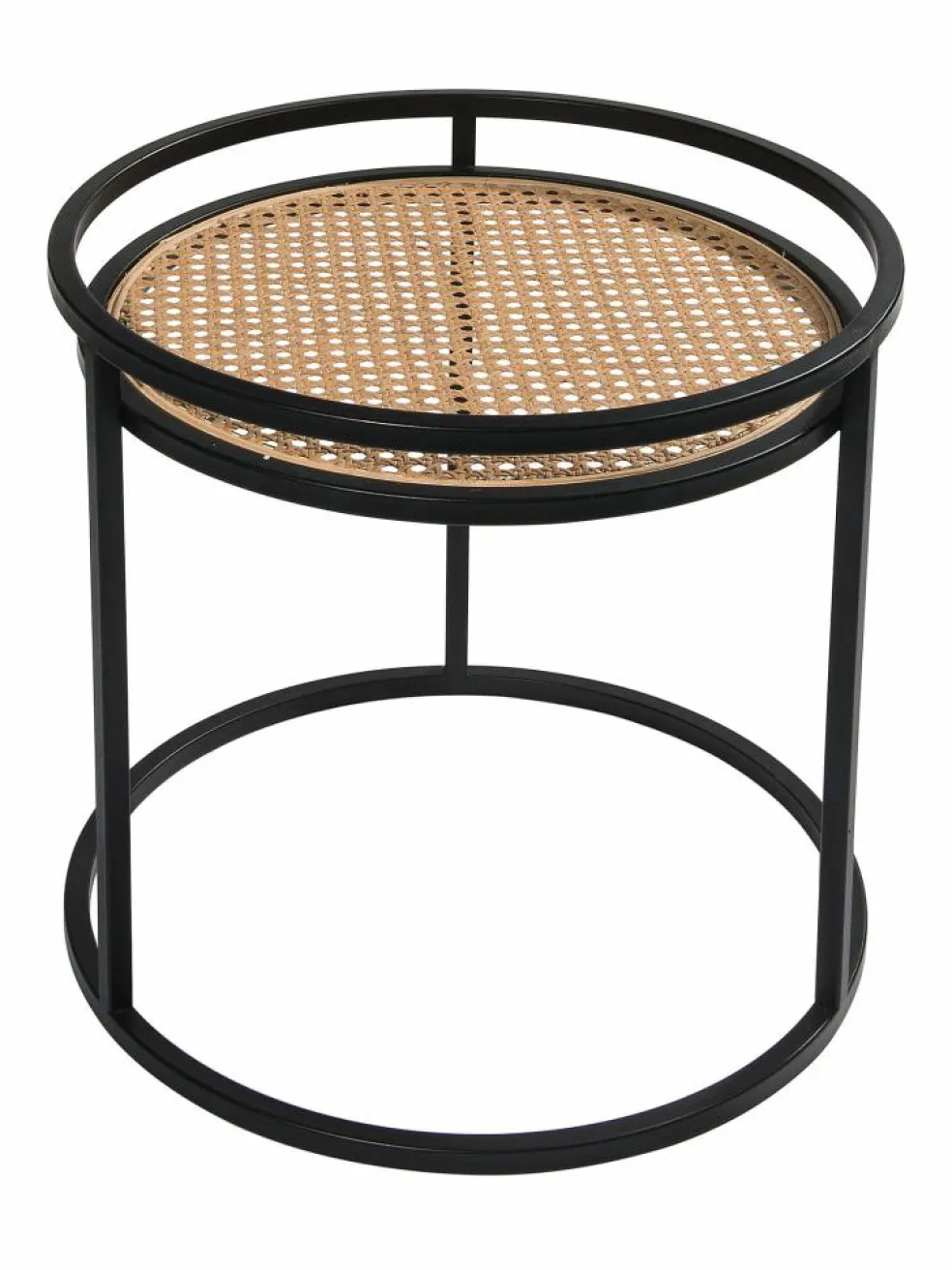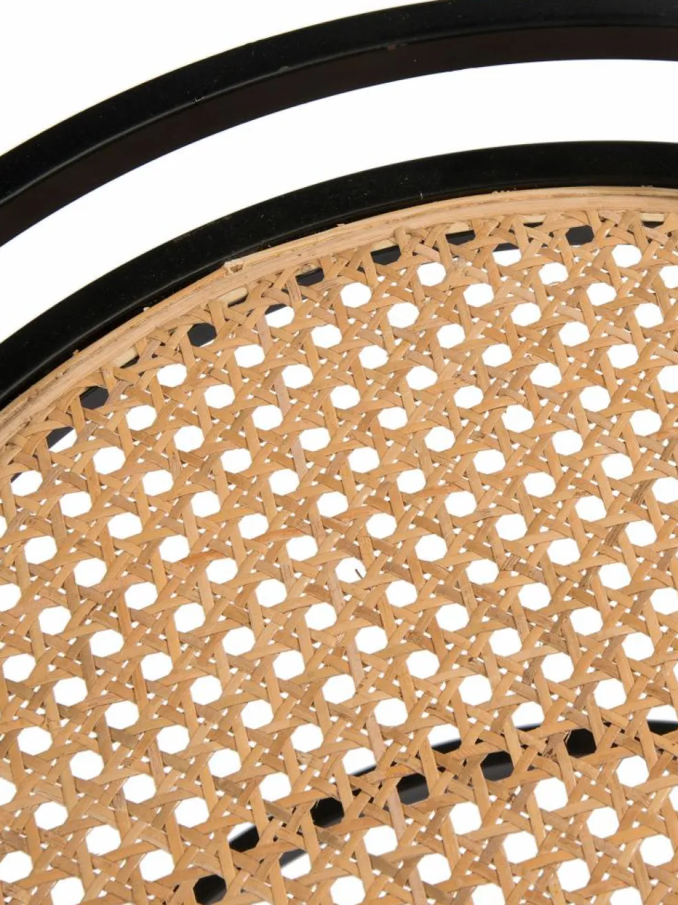 Runder Tisch mit Tischplatte aus klassischem Wiener Geflecht. Tischgestell aus schwarzem Metall.